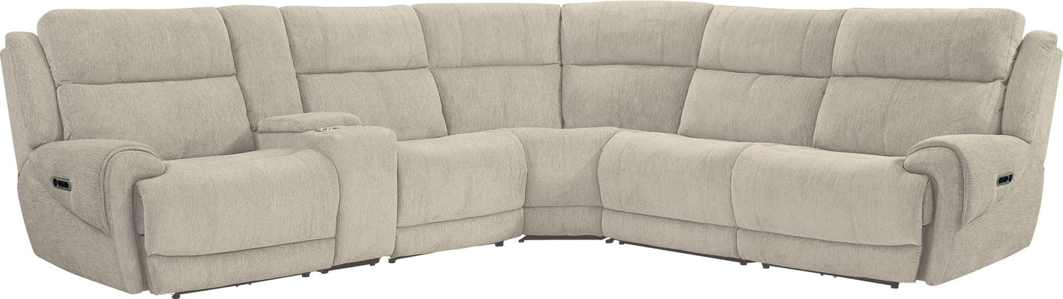 Destined to be everyone's favorite hangout, this six-piece sectional combination is the ultimate spot for rest and relaxation. You can't surpass the comfort of its two power recliners at each end that feature power headrests. Between those, there's a motorized power armless recliner, an armless chair, a corner wedge and a multifunctional storage console with cupholders.