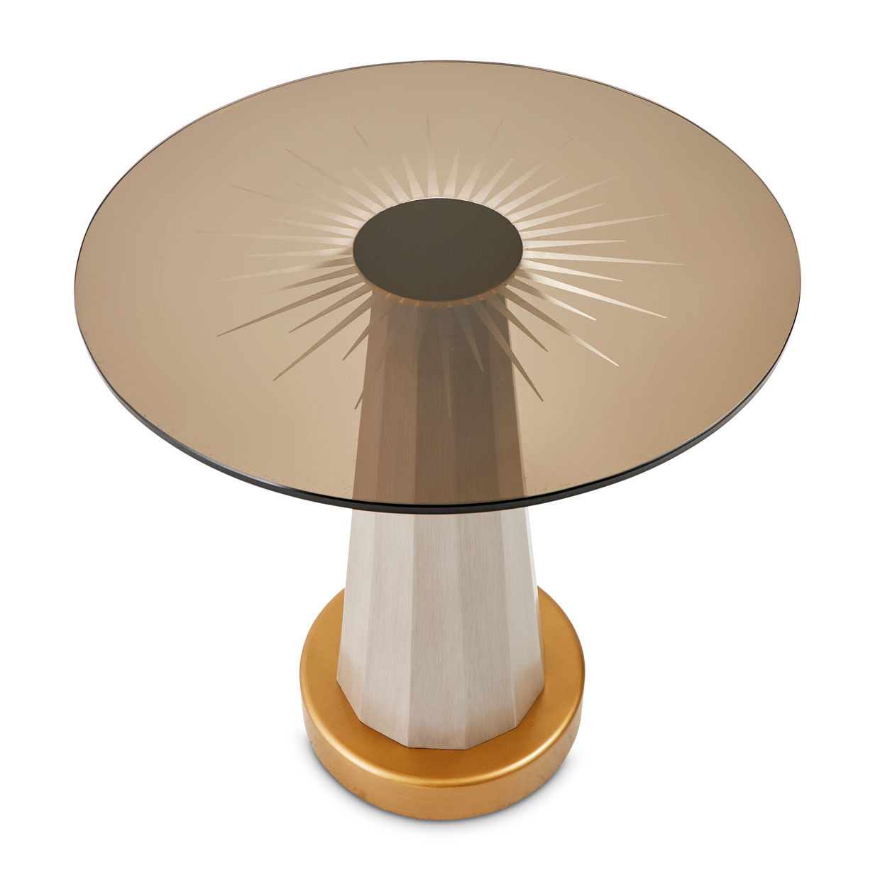 - The table’s pedestal and bronze finish echo the rays of the sunburst motif.