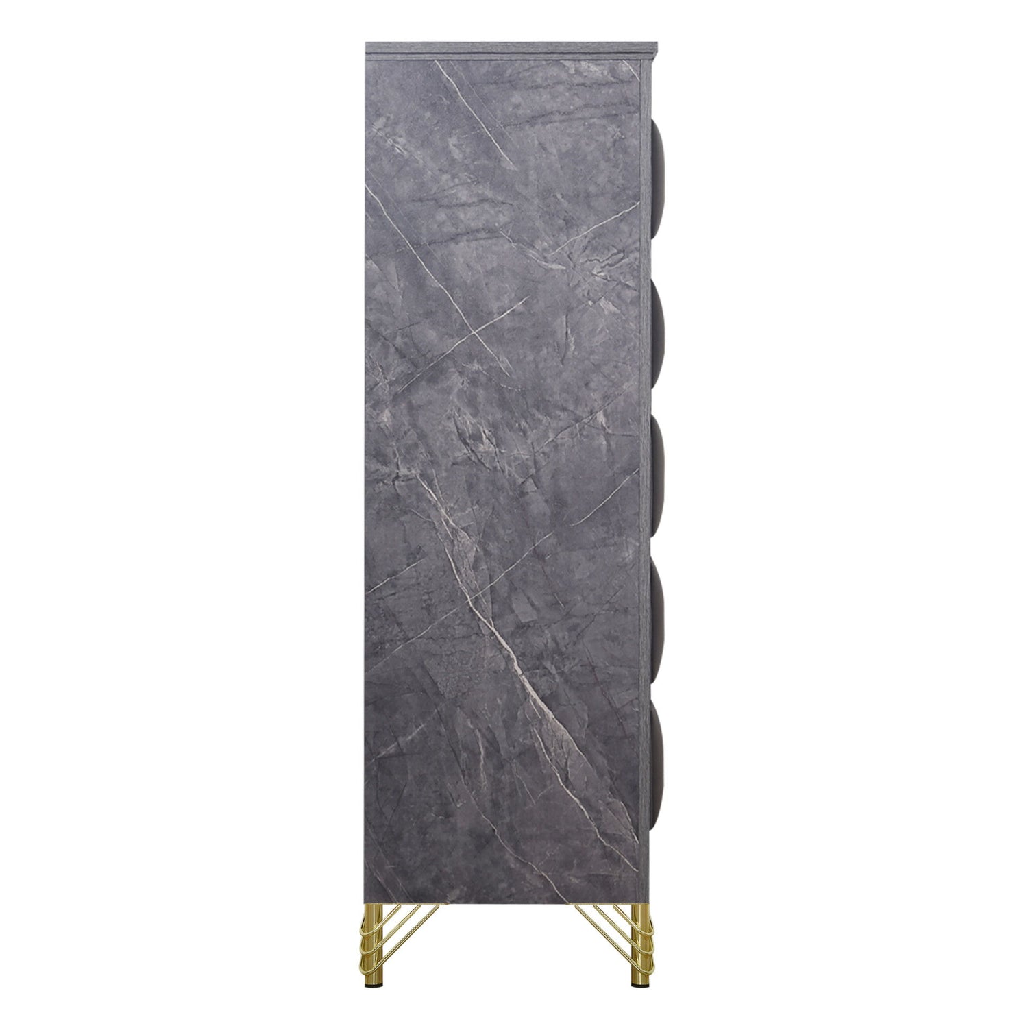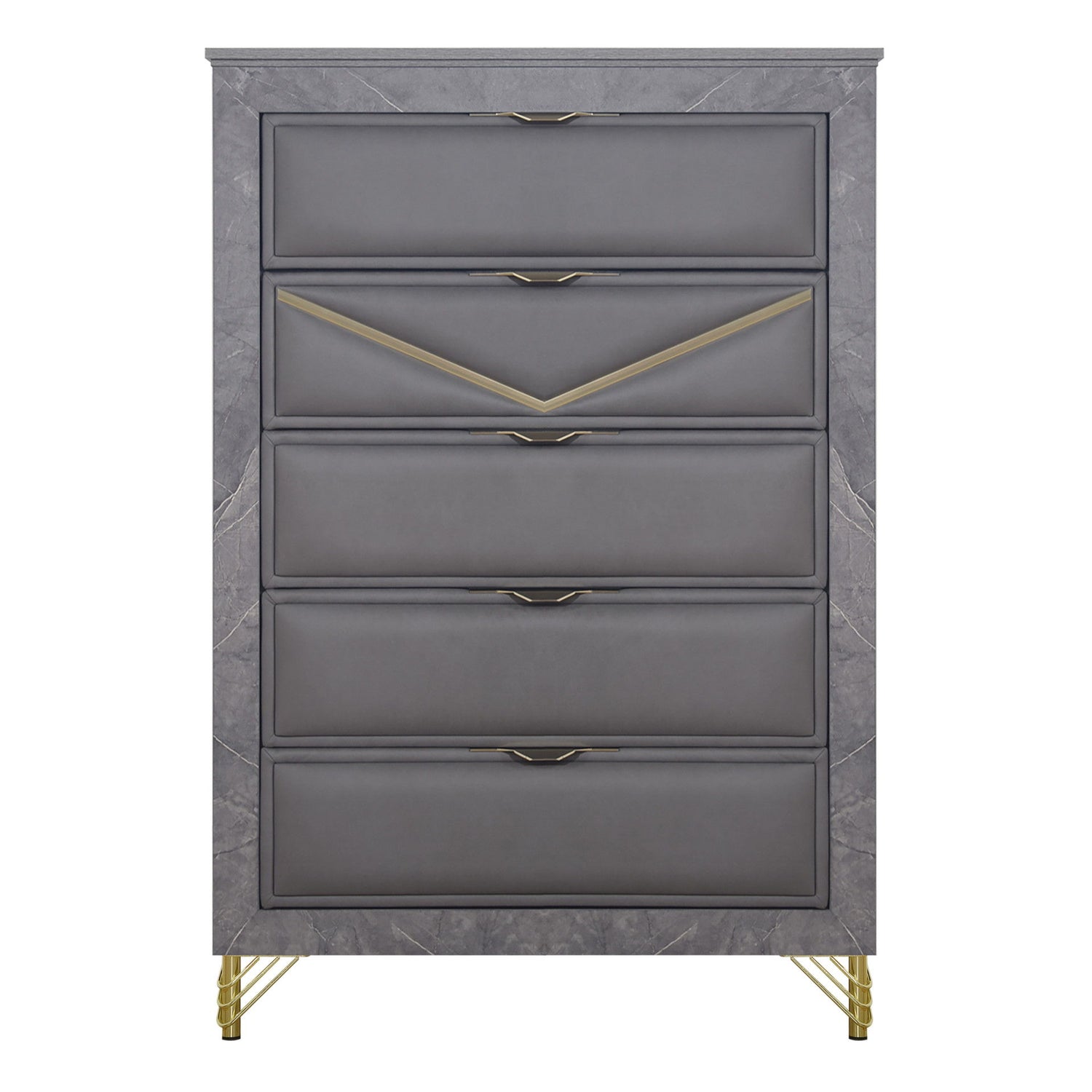 The Symmetry 5-Drawer Chest in Charcoal Gray blends form and function with modern elegance. Crafted from premium woods with a gray marble laminate, it offers durability and a sleek aesthetic. Ultra-soft gray fabric drawer fronts, adorned with gold metal and mylar accents, add sophistication. English dovetail drawers glide smoothly on ball bearings for lasting strength. Providing ample storage and style, this chest is a perfect choice for enhancing any living space with elegance and utility.