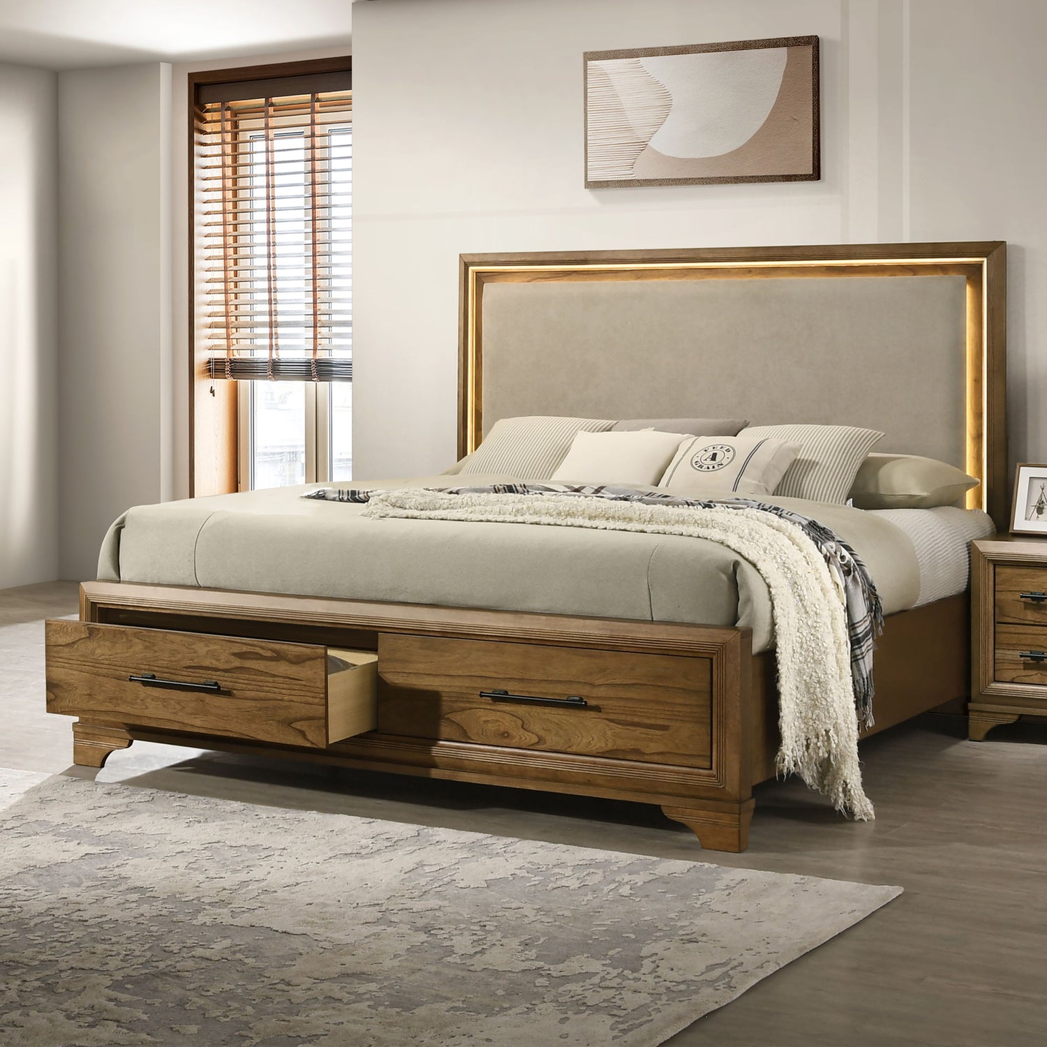 The Talcott wood bedroom set, featuring a platform storage bed with a lighted headboard, dresser, mirror, and nightstand in a warm finish, offers durable, quality construction crafted from solid rubberwood, manufactured woods, and mindy wood veneers. This collection embodies a transitional style, blending traditional and contemporary elements for a look that is both elegant and inviting. The platform bed''s upholstered headboard provides a comfortable backrest, complemented by LED lighting controlled by a touch switch, and storage drawers in the footboard offer a convenient place for blankets. Distinctive bracket feet, robust picture frame moldings, and sleek elongated drawer pulls add a unique and modern flair to your bedroom. The premium drawers, constructed with dovetail joinery and ball bearing glides, ensure smooth, full-extension operation and snag-free storage. Functional extras include a 6-drawer dresser that provides ample clothing storage, the 2-drawer nightstand to hold bedside essentials, both with velvet-lined top drawers protecting delicates. This platform bed is equipped with slats designed to support your mattress without the need for a box spring, making it a practical and stylish choice for your bedroom. Choose the Talcott bedroom set for its unparalleled combination of durability, functionality, and sophisticated design.