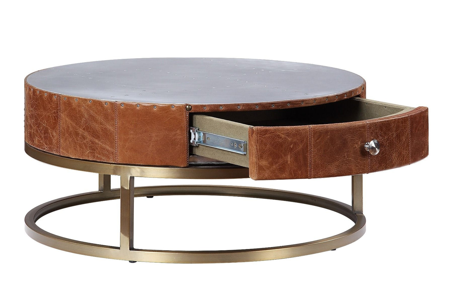 Assambled, Drum End Table Storage: 1 Drawer Patchwork Aluminum Top & Top Grain Leather Apron Metal Round Frame (Open Base) CONSTRUCTION TOP/Drawer: Aluminum, Top Grain Leather Apron, Frame: Ply Metal Frame Base: Iron (Size 7"H)