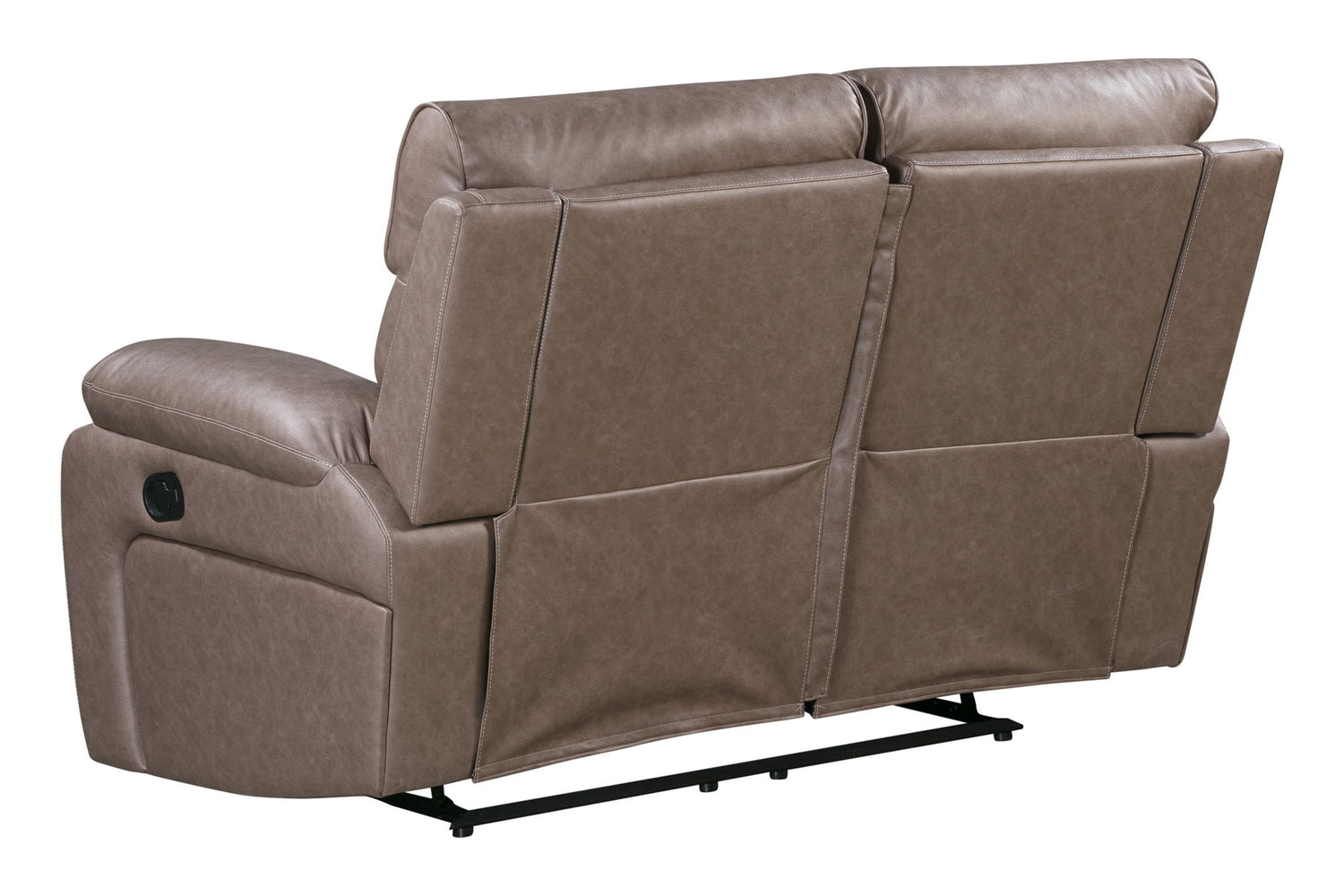 Oversized features, neutral coloring, and a faux-leather look and feel converge to create a strong, masculine aesthetic for the Theon Loveseat. Features include easy-to-operate latches for manual recline and outside arms that have been outfitted with cup holders. Theon's contoured bucket-style seats combine with generously-stuffed plush arms and a bustle-back pillow headrest for full body-conforming comfort. Soft contour lines of the piece offset some of the hardier design elements. No matter where it is placed or how often it is used, Theon offers a remarkable value-driven solution to relaxation.