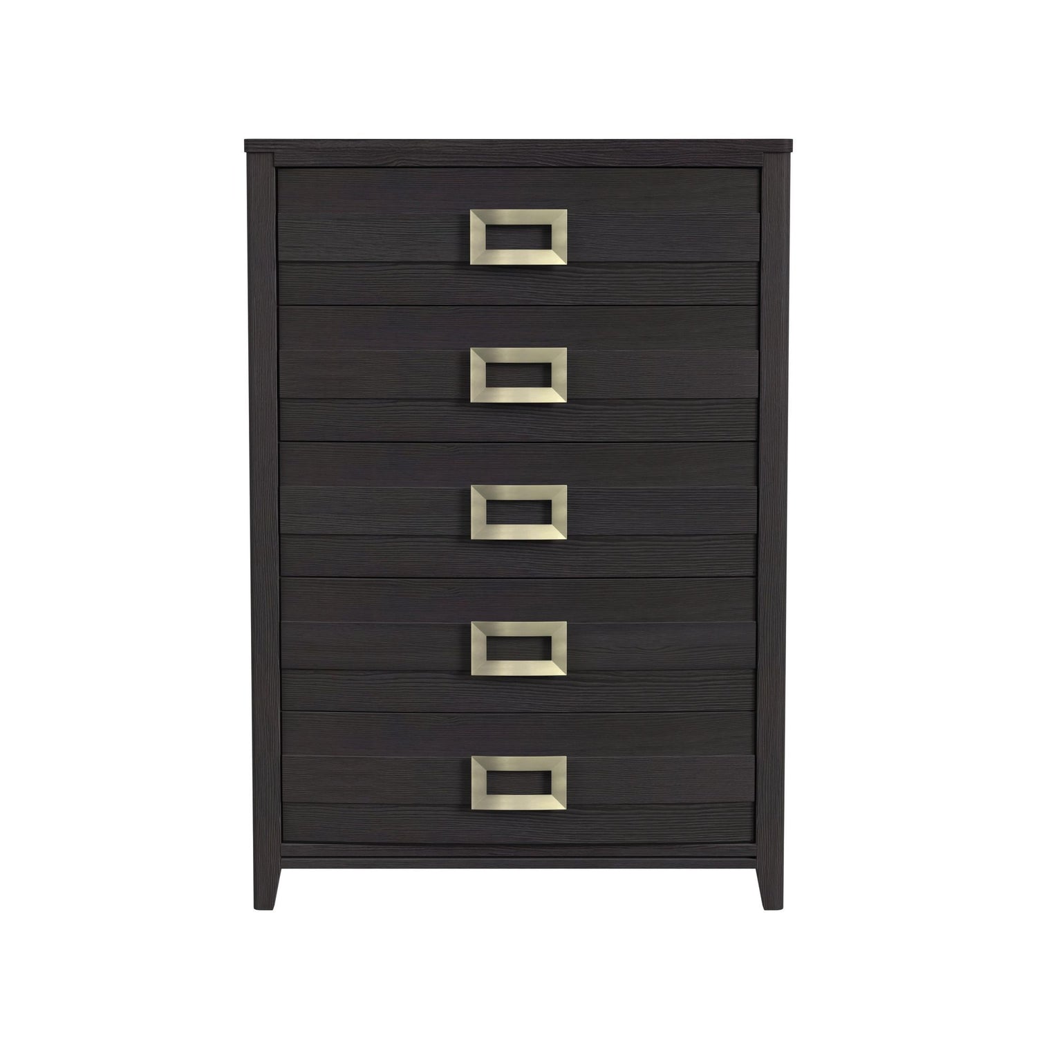 The Tobias 5-Drawer Chest is a sleek and modern addition to your home. Designed with gently sloping horizontal slats that create uniquely rhythmic balance and robust silver drawer pulls that effortlessly draw the eye, this piece adds a sense of refinement to any space it occupies. Multiple drawers lend themselves to practical utility, while slightly beveled feet provide a firm and reliable foundation. For a piece that is sleek and stylish, the Tobias 5-Drawer Chest delivers in quality and design.