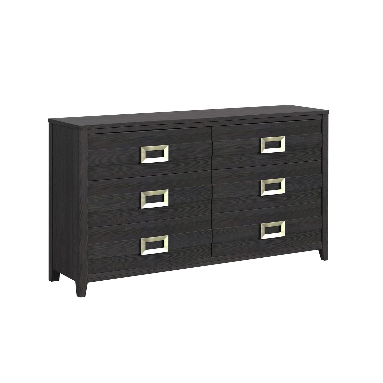The Tobias 6-Drawer Dresser is a sleek and modern addition to your home. Designed with gently sloping horizontal slats that create uniquely rhythmic balance and robust silver drawer pulls that effortlessly draw the eye, this piece adds a sense of refinement to any space it occupies. Multiple drawers lend themselves to practical utility, while slightly beveled feet provide a firm and reliable foundation. For a piece that is sleek and stylish, the Tobias 6-Drawer Dresser delivers in quality and design.