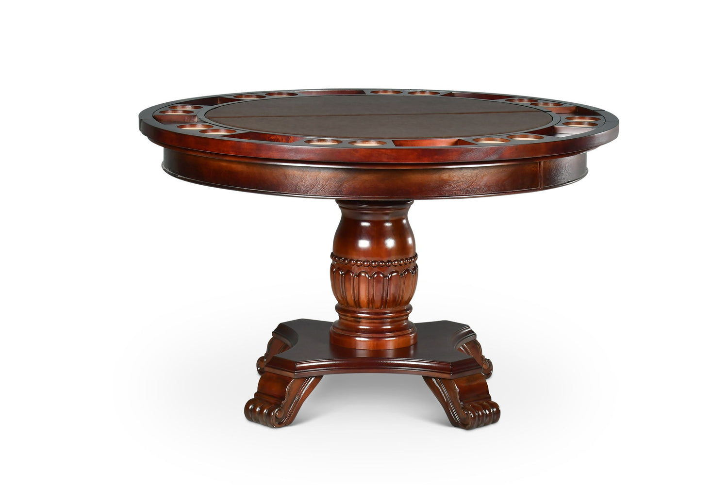 The Tournament Round Dining Table is constructed of the finest hardwood solids and cherry veneers. The table base features a detailed pedestal with a beaded and fluted design. The scrolled bun feet add the finishing touch to the base. An added bonus to the dining table is the folding game top that has chip and drink holders along with a faux leather playing surface in your choice of brown or black. Also available for purchase separately are the matching black or brown captains chairs.
