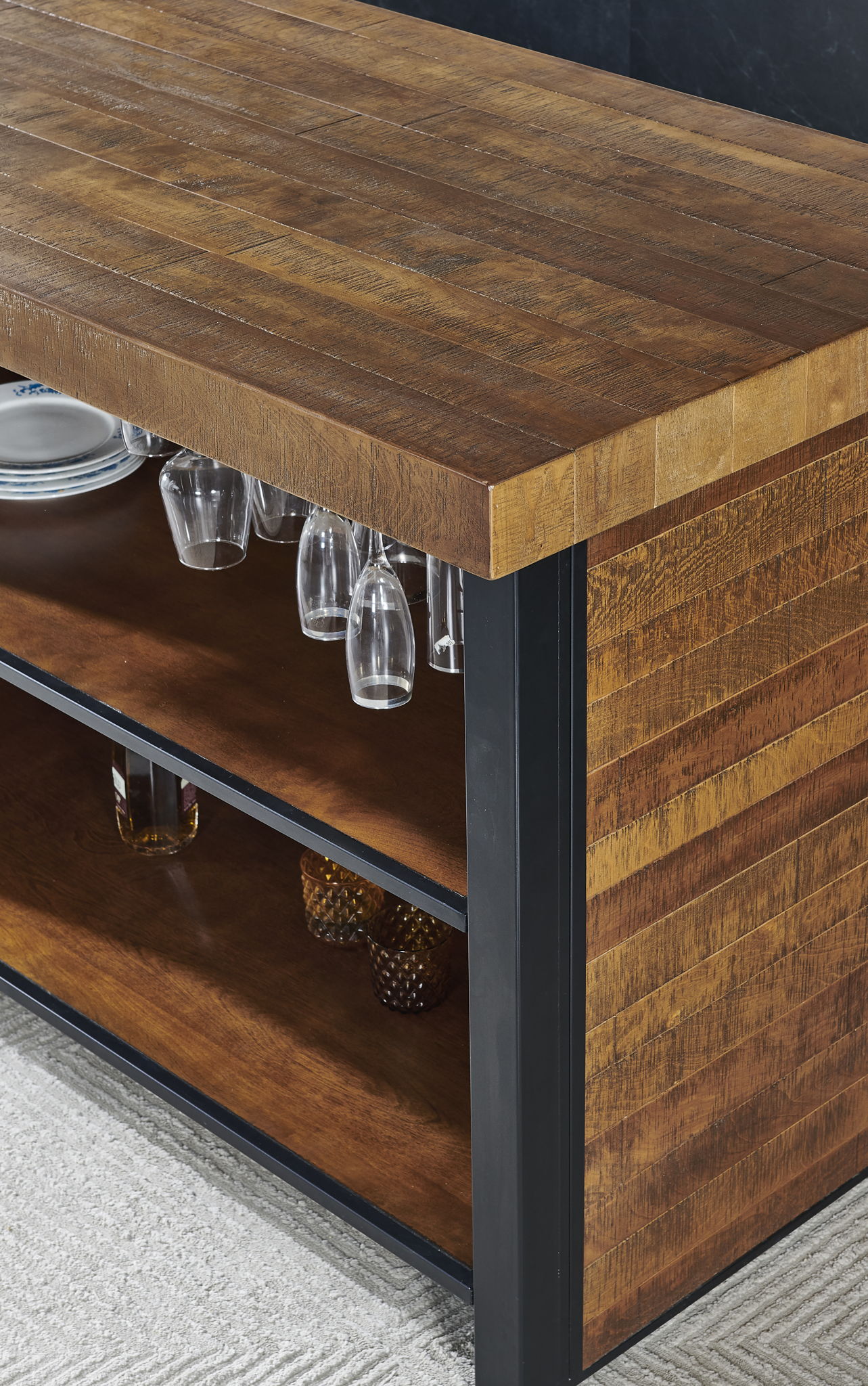 Sturdy and rustic, the Tyler 38-inch Bar Set delivers a slice of nostalgia mixed with a casual and relaxed design.A glowing rustic Chestnut finish highlights the grain and character of the birch veneers in a distressed application that beautifully accents the powder-coated ebony metal. Storage abounds in the back of the bar for all your serving needs including a hanging stemware rack. The Tyler Counter Stool offers 360 degree swivel with a padded, easy-care black leatherette seat that cleans with the wipe of a damp cloth. Comfort, style and organization...all delivered with the Tyler Counter Bar Set.