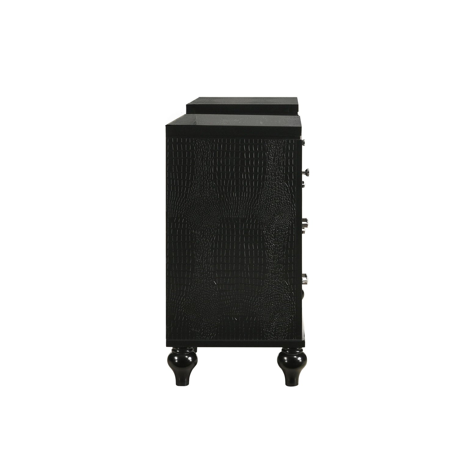 Introducing the Valentino 7 Drawer Vanity Dressing Table—a masterpiece of enduring craftsmanship crafted from a blend of manufactured and solid woods, adorned with exquisite embossed inlays. Revel in its glitz and glam, featuring a gleaming finish, mirrored trims, crystal-studded drawer pulls, and alligator-embossed accents that exude Hollywood allure. Delight in its thoughtful details, from heirloom-crafted English dovetailed drawers with snag-free interiors to smooth full-extension ball-bearing glides. With an abundance of storage, this vanity table offers ample space to organize cosmetics and accessories, including a luxurious velvet-lined drawer for jewelry. Transform your beauty routine into a glamorous experience with this exquisite piece—a true reflection of style and functionality.