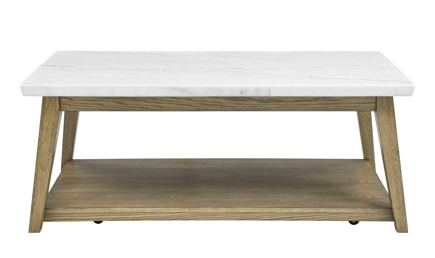 Elements of Mid-Century Modern and Scandinavian Contemporary combine in this casual yet elegant Cocktail Table. Clean lines and a natural dusty blonde finish add a light and airy look that blends beautifully with neutral interiors. A castered bottom means easy mobility to easily move the table away from reclining upholstery or out of the way for cleaning. The bottom shelf comes in handy for storage or display. Wrap it all up in one package for a great centerpiece to a lovely living room setup.