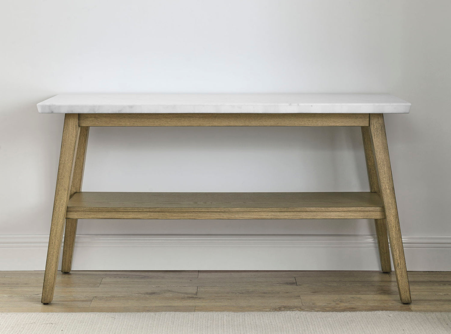 - Styling details include knife edge marble top, canted solid wood legs and bottom shelf for storage or display