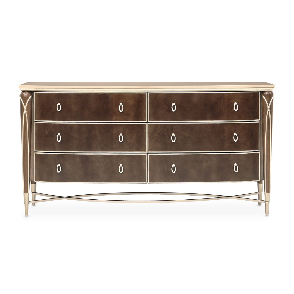 Find elegance in every detail with the Villa Cherie Dresser. Featuring a subtly shaped case front, sweeping accents, and velvet lined hidden storage, this piece creates a beautiful space for clothes, accessories, and décor.
