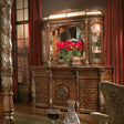 The striking and ornate style of the Villa Valencia Dresser and Mirror is bound to be admired. Elaborate carving and marble accents create a beautiful compliment to expertly crafted marquetry details. Along with its spectacular design, you will find that this traditional dresser also provides abundant storage. A combination of drawers and hidden storage ensure your items stay organized. In addition to the nine drawers that are seen, two more drawers are hidden behind the double-door center cabinet. The bottom drawer is cedar lined for freshness, and the top drawer is felt lined to protect your delicates. Matching mirror has display curios with lighting at each side, enhancing the overall look. A light box at the top adds a warm glow to your bedroom.