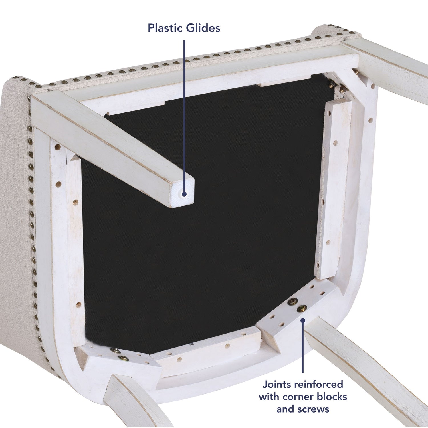 Unveil the timeless elegance of the Warren Arm Chair, a transitional masterpiece inspired by the classic wingback design. Delicately refreshed with a distressed white finish and adorned with modern moonlight gray fabric, accented by oil-rubbed brass nailhead trim, it exudes sophistication. Sink into its plush comfort, supported by a curved back and slender arms, while the generous 5-inch seat invites serene contemplation. Versatile enough for any setting, whether gracing a dining table, enhancing a den, or commanding attention in a man cave, this chair promises both solace and distinction