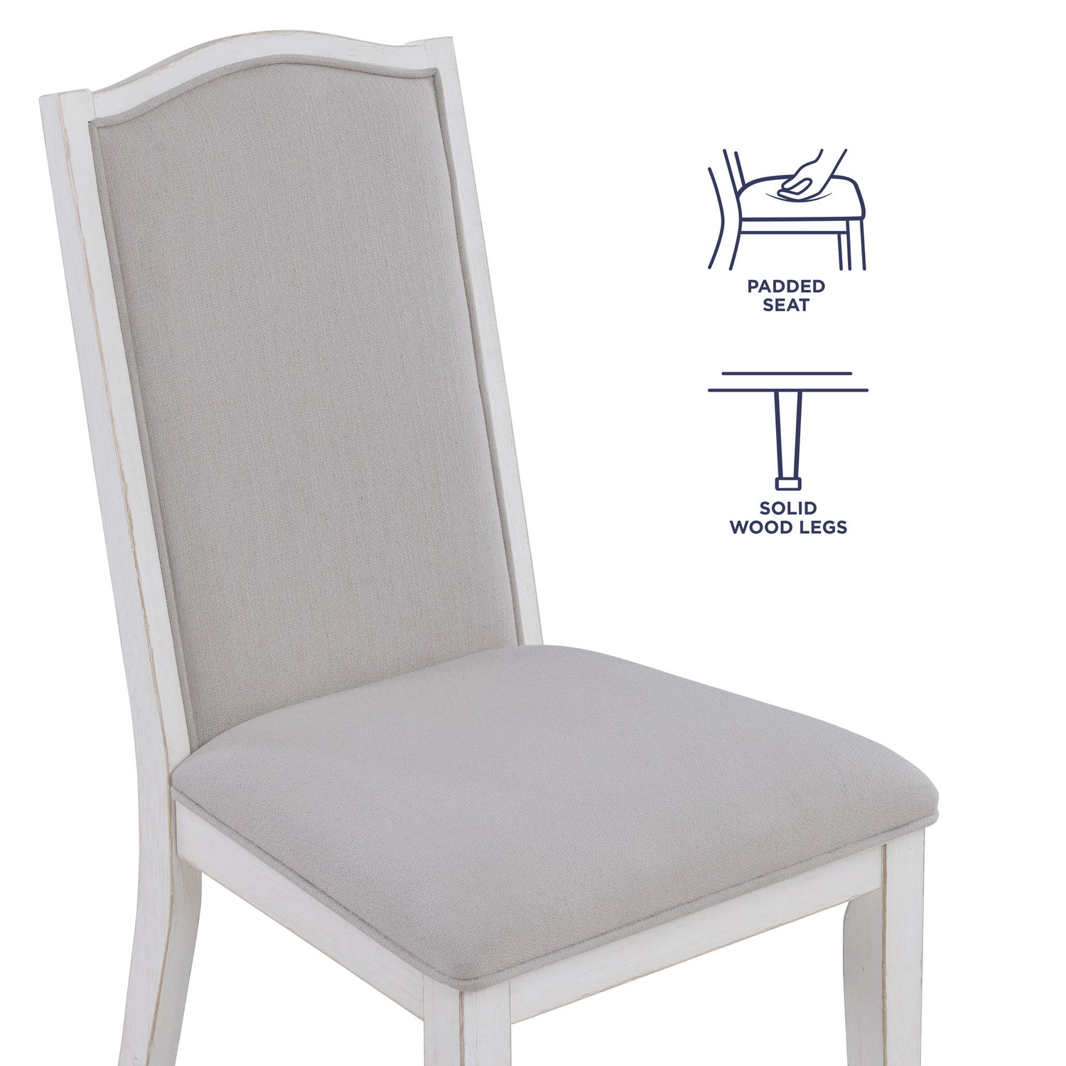 Comfort meets style seamlessly in the Warren Side Chair. Upholstered in a lush gray, linen-look 100% polyester fabric, it promises a delightful seating experience whether you're dining, working in the office, or simply enjoying its presence as an accent piece. The wood-rimmed camel back and solid wood legs, finished in a stunning distressed white with rub-through on the edges, exude rustic elegance. Versatile and charming, this chair effortlessly enhances any setting, inviting you to relax in both comfort and style. Elevate your space with the timeless appeal of the Warren Side Chair.