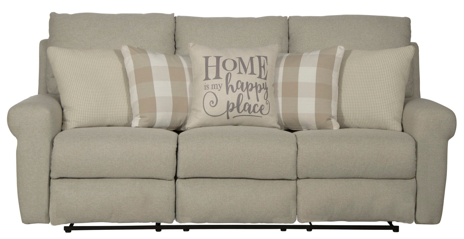 The WESTPORT lay flat reclining sofa features a Farmhouse Casual style with its Greek Key arm treatment, soft body fabric, and 5 included accent pillows.