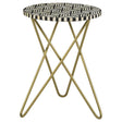 Make a bold statement with this elegant accent table, featuring a hand-inlaid bone and black resin mosaic that creates a striking geometric design. The round tabletop rests atop a sculptural butterfly-style hairpin metal base in a lustrous gold finish, adding a touch of glam sophistication. Designed for both functionality and artistry, this table is perfect as a side table, plant stand, or entryway accent. Each handcrafted piece is unique, blending contemporary aesthetics with classic craftsmanship to elevate any modern or eclectic interior.