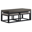 Complete your living space with the Yukon Rectangular Nesting Coffee Table, a generous 50" long centerpiece perfect for any living room. This versatile piece offers the added bonus of two nesting stools, ideal for convenient additional seating or as footrests for other chairs in the room. Stored out of the way beneath the table, these stools can effortlessly be pulled out when needed. The mixed media elements of the set combine a lustrous walnut color finish atop a sturdy black iron base, delivering the perfect blend of style and function. With its clean, unadorned lines, this table seamlessly integrates into any environment, from traditional to modern, effortlessly enhancing your home's aesthetic.
