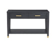A sleek modern Console for a hallway or behind a Sofa, the Yves Sofa Table adds beauty and dimension to any room. Tapered legs and brushed brass accents make for a contemporary design with the added plus of two fully functioning drawers that add handy remote storage to any room.