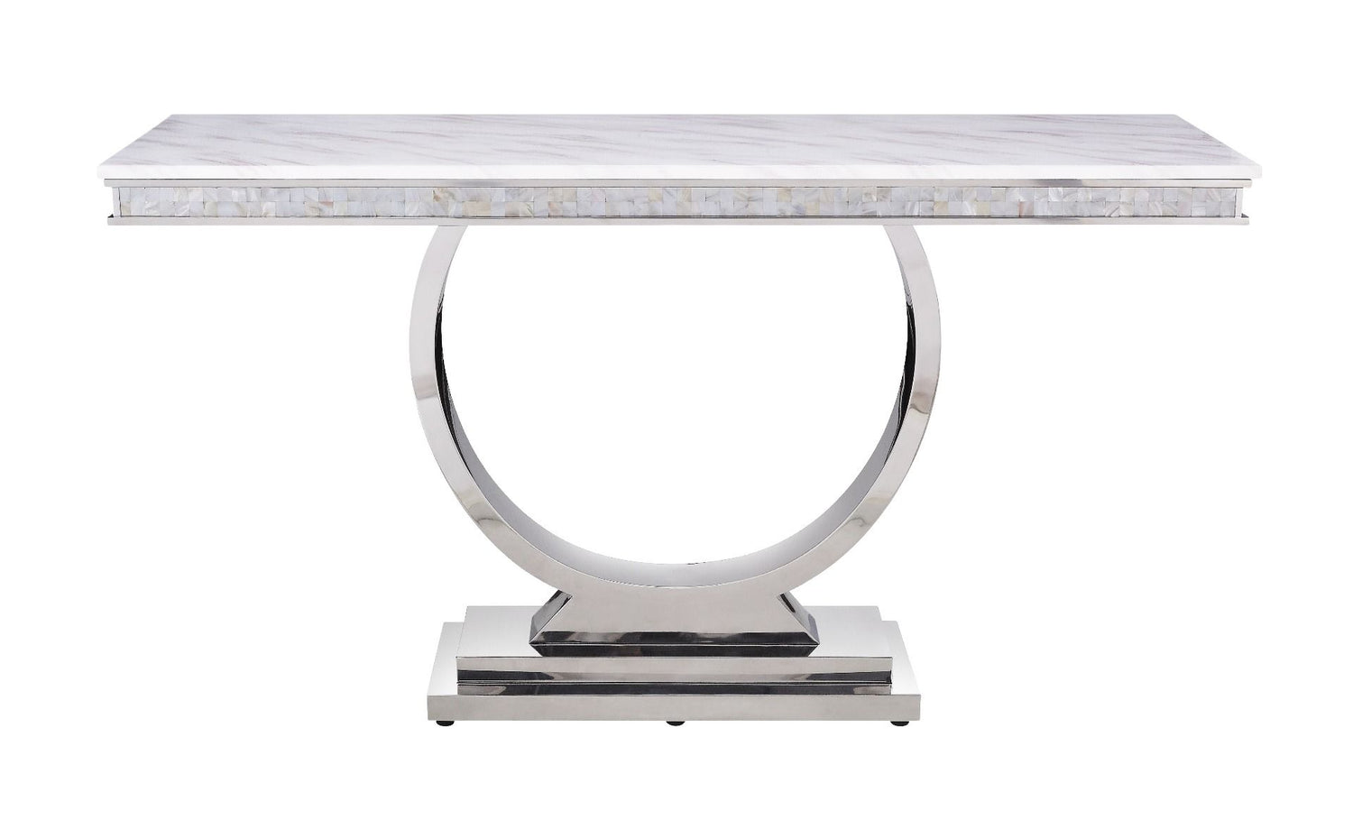This beautiful contemporary work places a strong emphasis on lustrous materials that make a bold statement of personality and style. Shiny metal frame and white marble top complement each other perfectly, making the table more visually appealing. The Zander Sofa Table has a circle-accented table base with mirrored silver finish for a modern glamour look. Cultured marble top features unique and attractive textures, highlighting your display with its luxurious appeal.